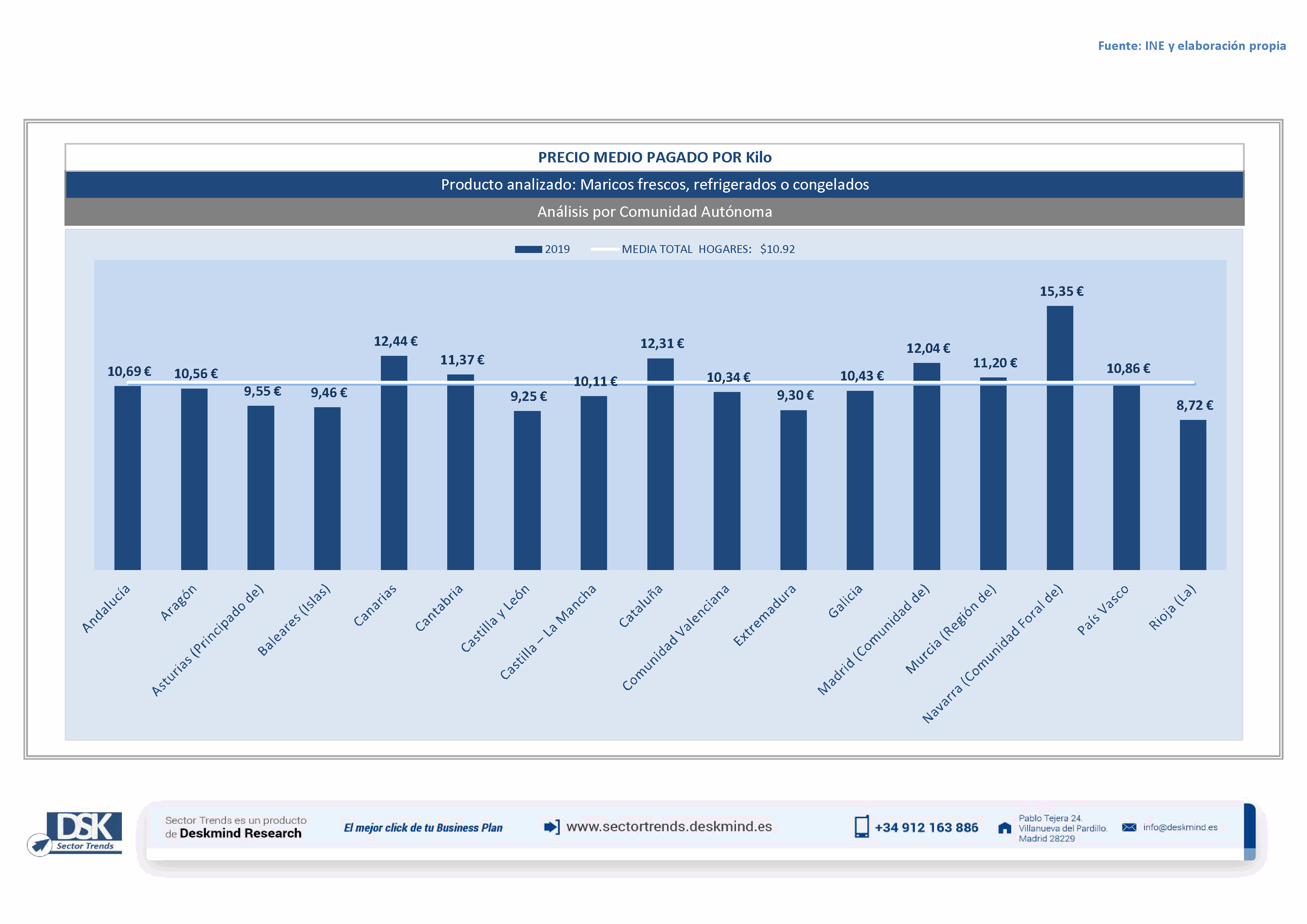 Infografía precio medio por comunidad autónoma de Maricos frescos, refrigerados o congelados