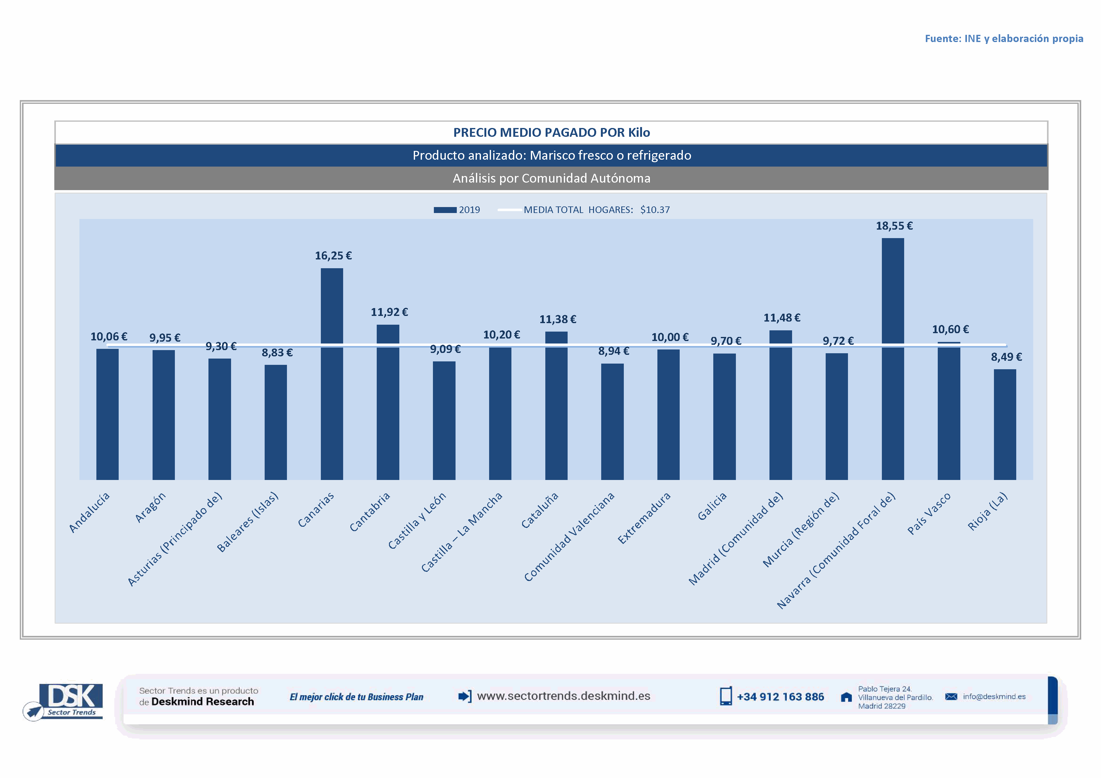 Infografía precio medio por comunidad autónoma de Marisco fresco o refrigerado